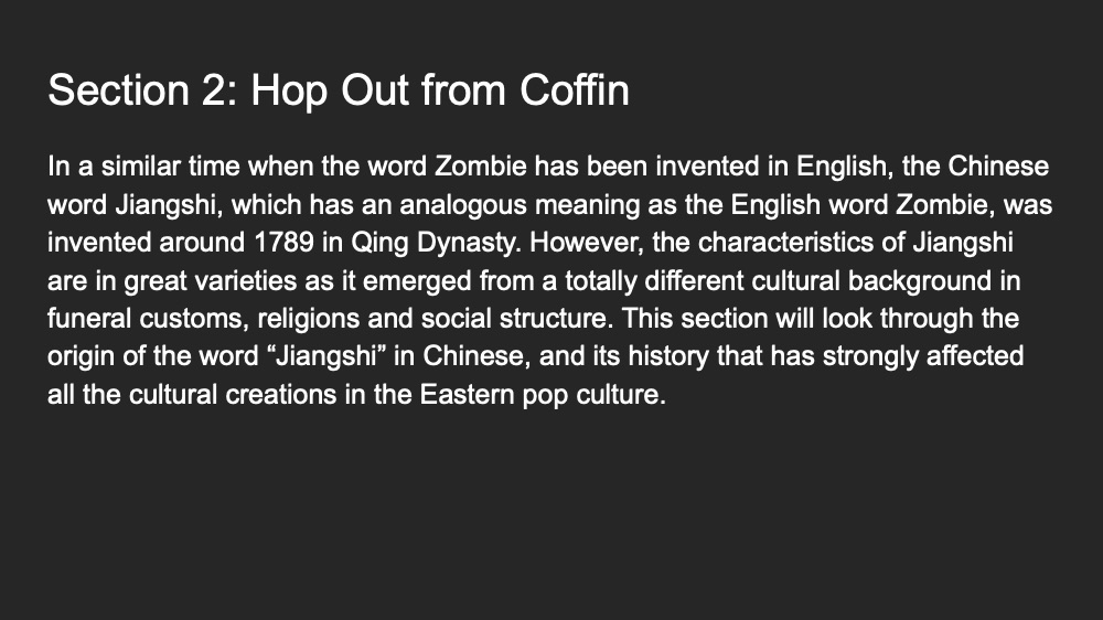 Zombies, the fictional undead being created through the reanimation of a human corpse, have a profound cultural impact on the people’s image of the horror genre, the entertainment industry, and even our colloquial linguistics. Gradually, zombies grew into a specific subculture genre that has its own features and there are two major cultural depictions of the zombies represented by Western and Eastern society, which are different in various aspects due to the diversities of history, religions, aesthetics, and folk customs between the West and the East.