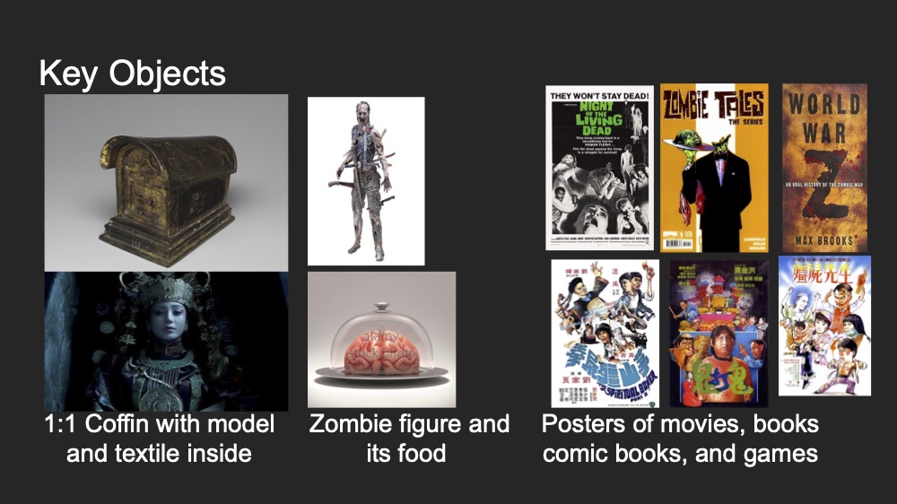 The exhibition will inform visitors of the history and origins of the word zombie in the beginning sections, as well as the horror icon itself. The objective of this exhibit is to illustrate the cultural evolution of the zombie and the broad impact on popular culture that zombie has made in a visually appealing way to the public. The following parts of the exhibition will look at the comparisons of two different cultures. The content of the exhibit will be organized chronologically along a dual path representing the western and eastern manifestation of the zombie.